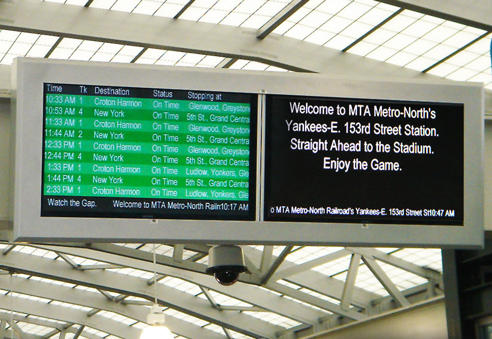 In the Winter of 2009, Metro-North Railroad unanimously chose to update its outdated informational, static signage. The original signage was used for train and ferry passengers and out-of-town sightseers at the particularly busy Yankee Stadium station. The all-new digital signage would be utilized to display real-time rail commuter information and ever-changing transportation schedules.