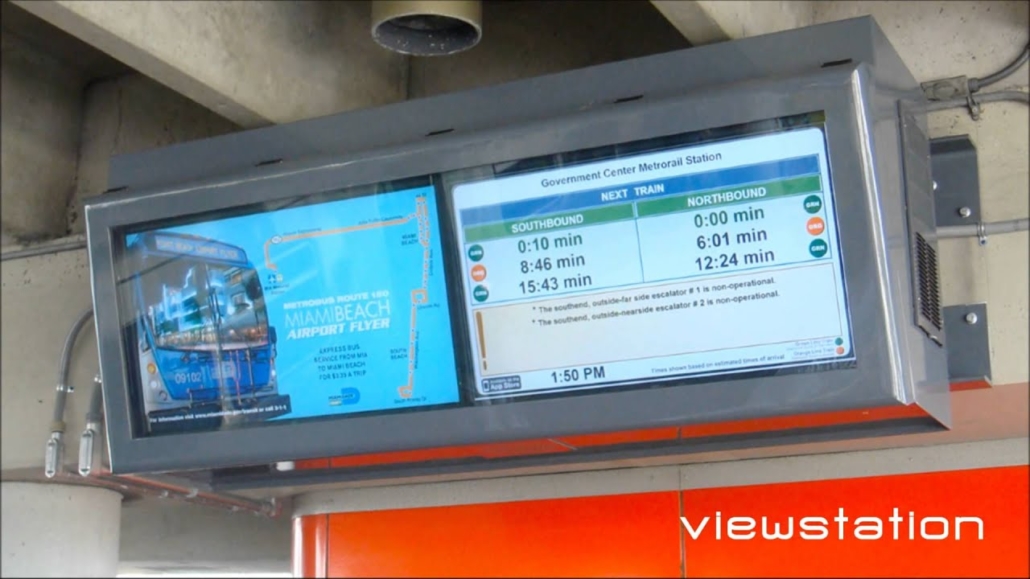 From the Summer of 2011 to the Fall of 2013, more than 25 stations across the Miami region were upgraded with digital signage enclosures, including over 90 ViewStation Array 2×1 LCD enclosures. With custom mounting, each enclosure houses two 40-inch LCDs side-by-side in landscape orientation and are fitted with an integrated speaker system for announcements. To solve the problem of vandalism, a four-layer sacrificial window film was added to the glass of each enclosure. In addition, 8 custom 55-inch ViewStation enclosures were designed specifically for Miami-Dade’s MIC (Miami Intermodal Center) station. The MIC station is located near the Miami International Airport. The custom enclosures were retrofitted into existing static signage, which saved Miami-DADE time and money.
