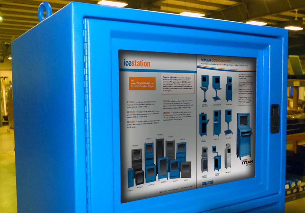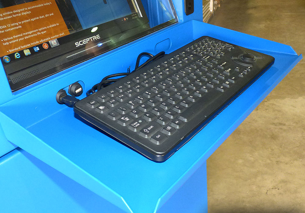 After visiting the plant, ITSENCLOSURES made the recommendation to deploy the NEMA 12 IceStation TITAN freestanding enclosure in areas that did not require a heavy washdown. Each Puratos enclosure houses a barcode printer, computer, and a wide screen format monitor. ITSENCLOSURES also provided a side mounted enclosure to house a hand-held barcode scanner, installed on the right side of the cabinet. An industrial, heavy-duty keyboard/hula point combo mounts to the sloped work surface.