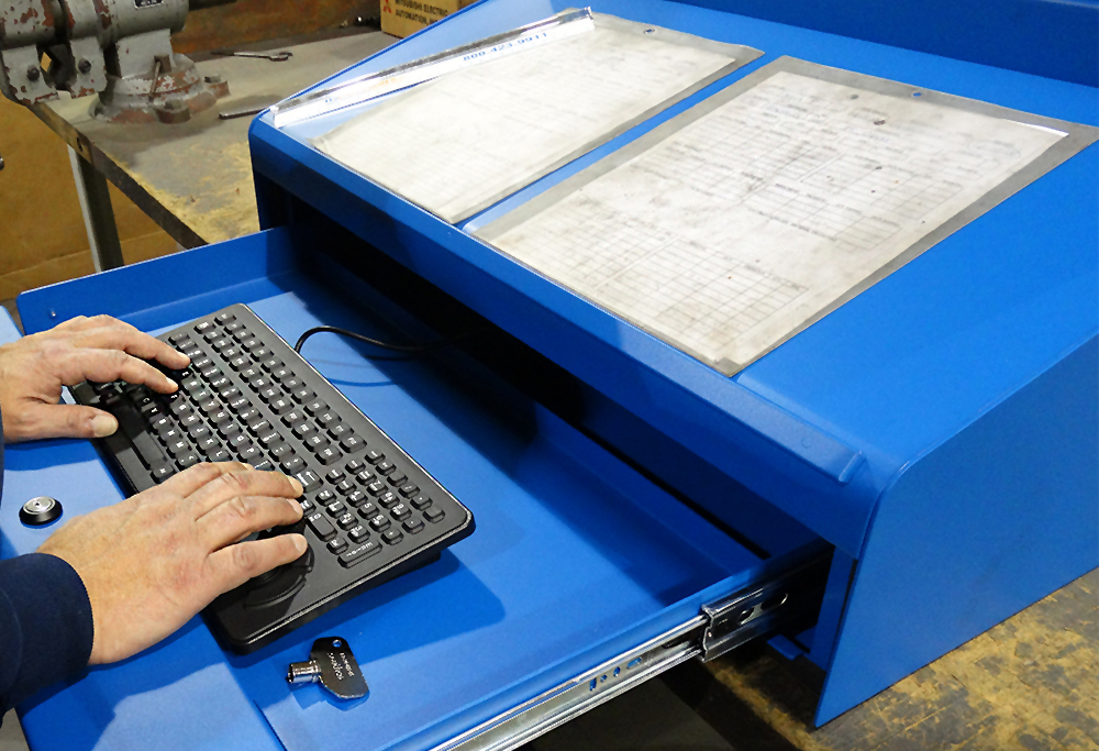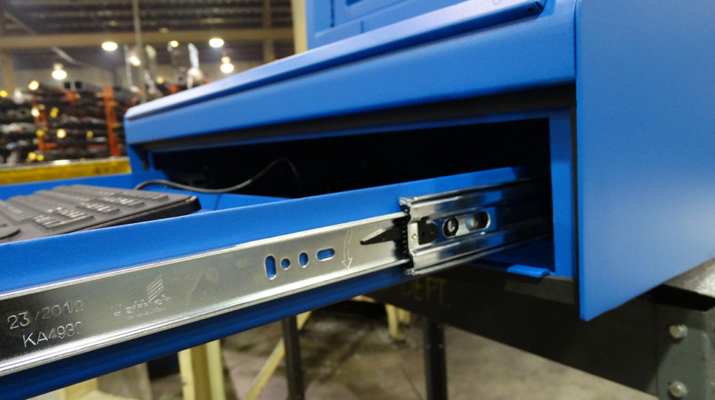 - Standard features include adjustable monitor shelf and integrated keyboard drawer with sloped work surface