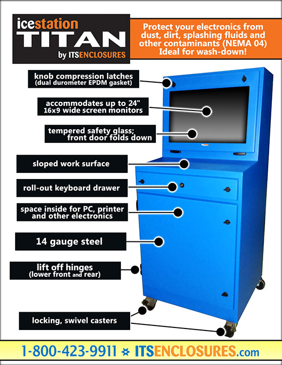 Keep your computer system up and running (indoors or outdoors) with the NEMA 04 IceStation TITAN pc enclosure. With our mobile computer cabinet, you can protect your electronics from dust, dirt, grease, harsh corrosives, and hose directed water.